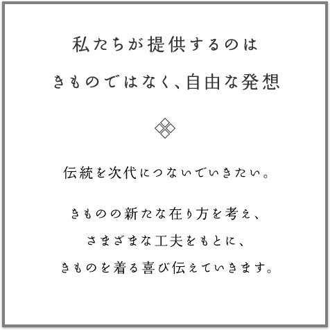 和装品を「売る」のではなく、「売れる仕組みを考える」ことが仕事です。きものを好きになってもらうきっかけや仕掛けを作り出すのはもちろん、契約企業の商品やきもの講師の魅力を最大限に引き出すことも、大切な役割です。